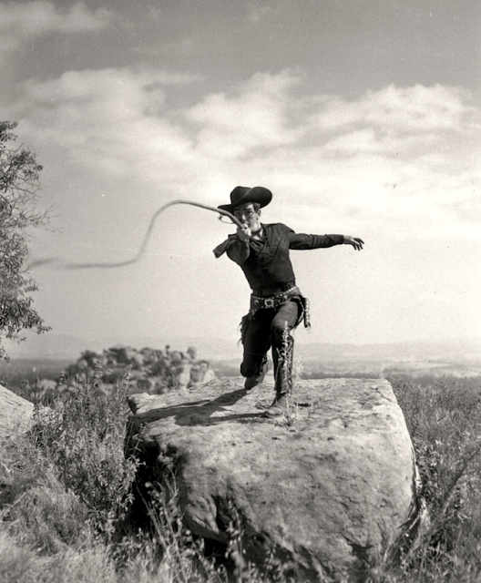 While he had no whip skills to speak of at the time he launched his acting career, LaRue learned fast — and it became his trademark, with Lash earning the nickname King of the Bullwhip. In the video at the bottom of this post, LaRue reveals to David Letterman that he lied about his ability with the bullwhip to land his first acting job. The above promotional still, courtesy of Western movie expert Jerry England, shows LaRue as an accomplished whipsman, plying his trade at the Iverson Movie Ranch, with Chatsworth's Stoney Point visible in the background. Hollywood legend has it that LaRue taught Harrison Ford how to use the bullwhip for the "Indiana Jones" movies.