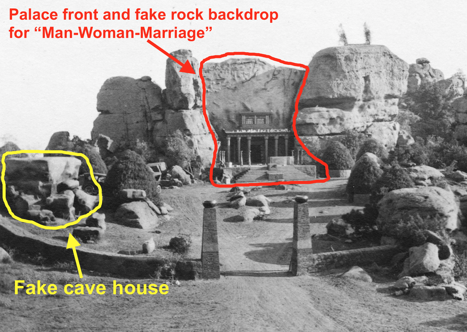 This slightly zoomed-in version of the "Man-Woman-Marriage" production shot highlights what I believe to be the same rock that now displays the "Garden" inscription. It appears to me that the small rocks just to the right of the "Garden" rock were covered up by the palace set. To see additional photos from the filming of the battle scene for "Man-Woman-Marriage," please click here.