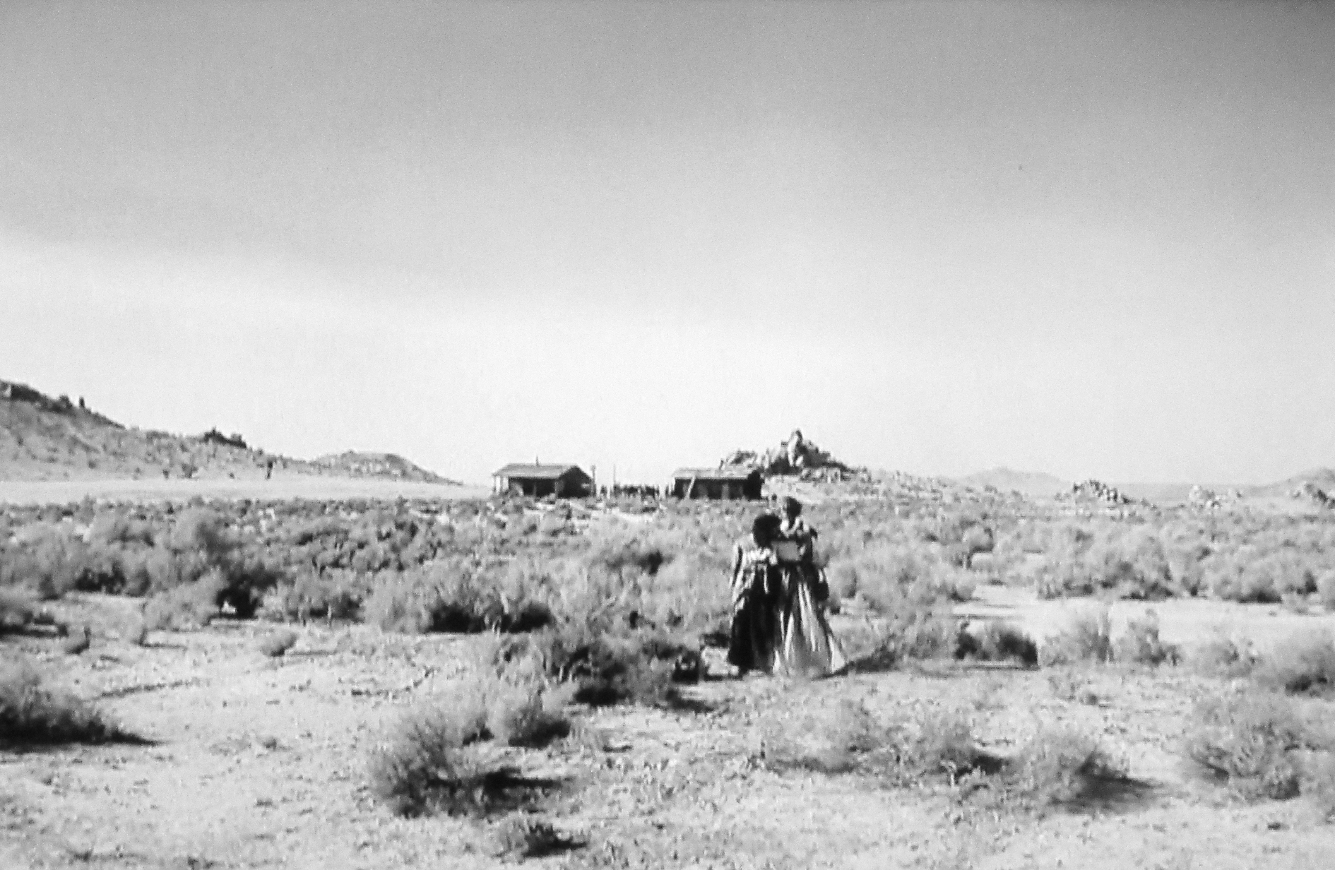 The ghostlike image of a background feature, barely visible behind the two women, is Piute Butte, another important movie landmark located a short distance north of Lake Los Angeles.