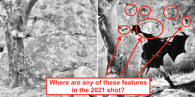 But there's more. Once again, the rock walls in the background of the two shots don't match at all. There's not a single marker on either wall that connects the two shots.
